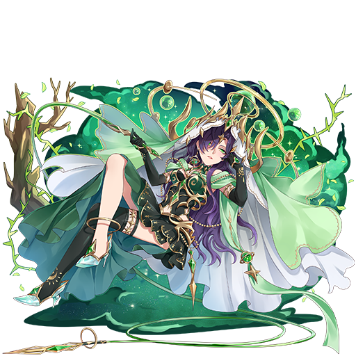 バトル開始時、木属性の味方全員に(気絶するダメージを受けた時、1度だけHP全快になる)(コンボ数が+4される)効果を付与する、クエスト時、木属性の味方の攻撃にかかるダメージ上限を7億引き上げる