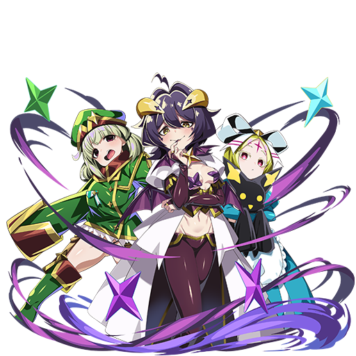スキル使用時に闇属性ピースを10個以上消していると、スキル2も同時に発動する、アリーナ時、先頭の味方の属性のピースが盤面にあれば、味方全体の与えるダメージが1個につき15%アップ、受けるダメージが1個につき10%軽減する(最大70%)、相手にも効果が発生