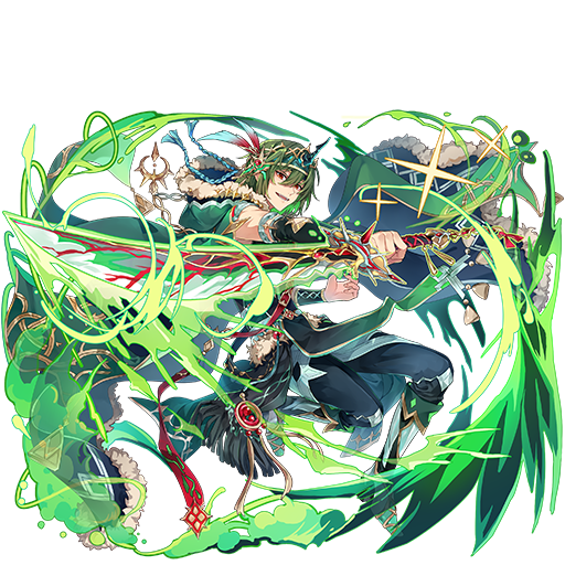 ピース操作前、水ピースと火ピース2個ずつを木ピースに変化する、自身の受けるダメージを5回だけ無効にする(固定ダメージや割合ダメージなどを除く)、スキル発動時、盤面の木ピース数が多いほど自身のスキル攻撃力が増加する