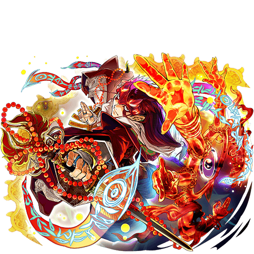 スキル使用時に火属性ピースを10個以上消していると、スキル1も同時に発動する、ターン終了時、「敵単体に火属性攻撃、盤面のランダムな横一列を破壊して火ピースにする」スキルを発動する