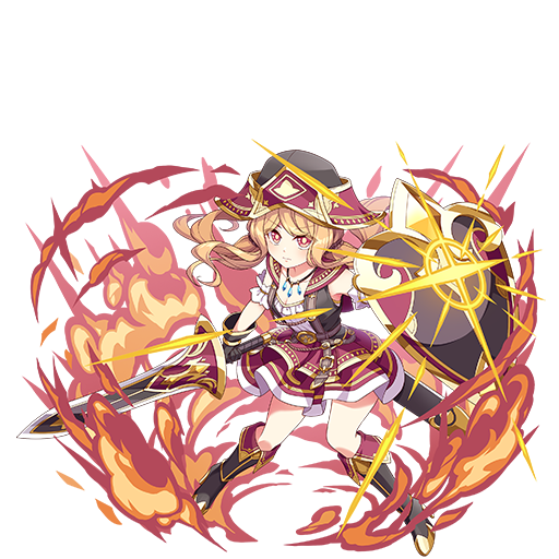 スキル形状を揃えたスキルをすべて発動できる、毎ターン、火属性の味方が敵にスキルで攻撃した際、1度だけスキル2で追撃する、バトル開始時、火属性の味方全員に(気絶するダメージを受けた時、1度だけHP全快になる)を付与する