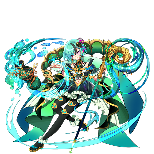 味方全員のHPが100%アップ、アリーナでは相手にも効果が発生(重複なし)、スキル形状を揃えたスキルをすべて発動できる、自身のスキルはどの属性のピースでも発動できる、さらにどんな属性のピースを消してもスキルの効果が大きくアップするようになる